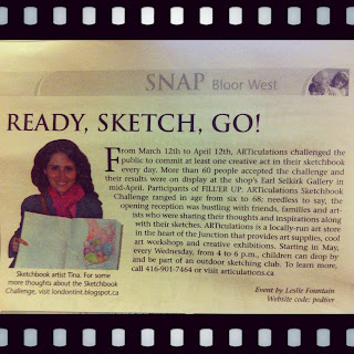 Remember that Sketchbook Challenge a while back? ... and the opening night at ARTiculations? ... Leslie from SNAP Bloor West was in attendance at the opening, photographing the event. I was happy to learn my picture and my sketchbook made it onto their paper along with an article she wrote about the event !